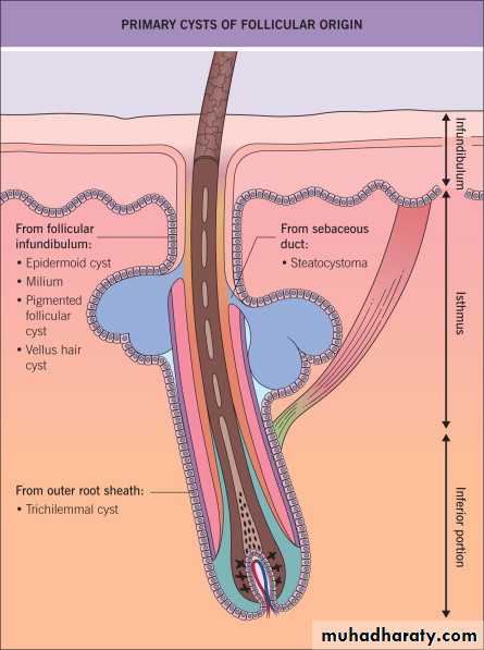 Present as a dermal nodules, may have a central punctum representing the follicle from which the cyst is derivedMultiple epidermoid cysts may occur in individuals with a history of significant acne vulgaris