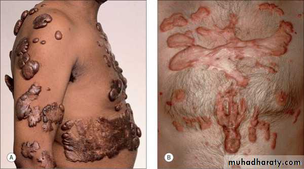 There is often a familial tendencyPresent as well-circumscribed pink to purple firm nodules or plaques which are painful or pruritic