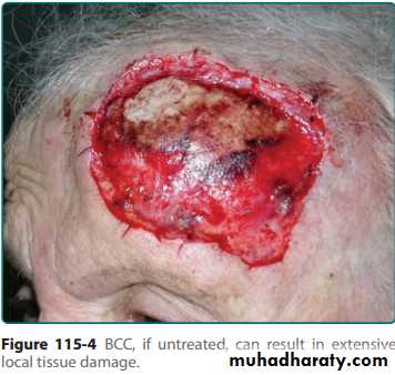 BCC typesNodular BCC: the most common type, translucent papule or nodule with telangiectasia , sometimes with a central depression or ulcer surrounded by a rolled edge