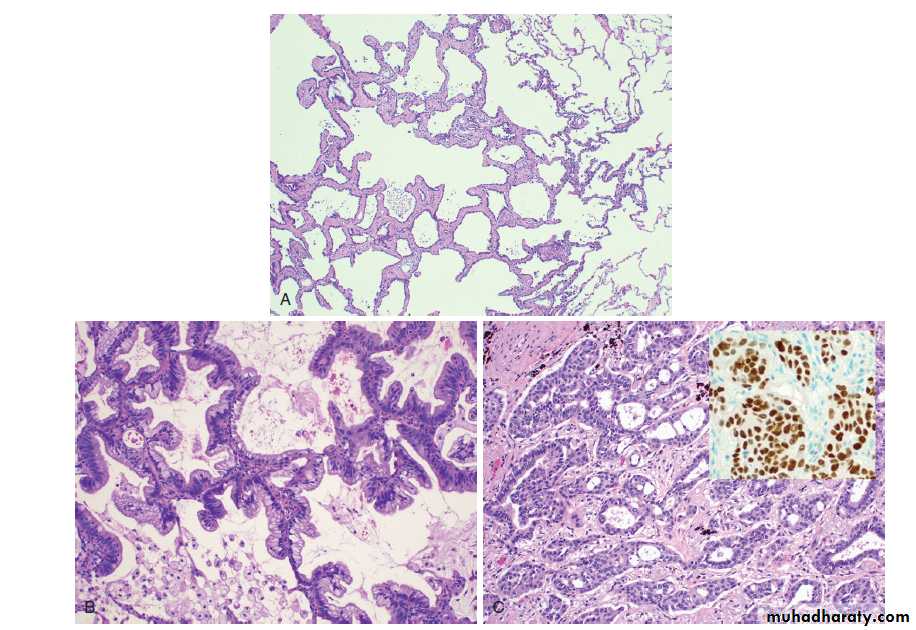 2. Adenocarcinoma : Arises from mucus gland in the bronchial mucosa, Consist of malignant glands with mucus secretion.The precursor of peripheral adenocarcinomas is thought to be atypical adenomatous hyperplasia (AAH) which progresses to adenocarcinoma in situ, minimally invasive adenocarcinoma and invasive adenocarcinoma.