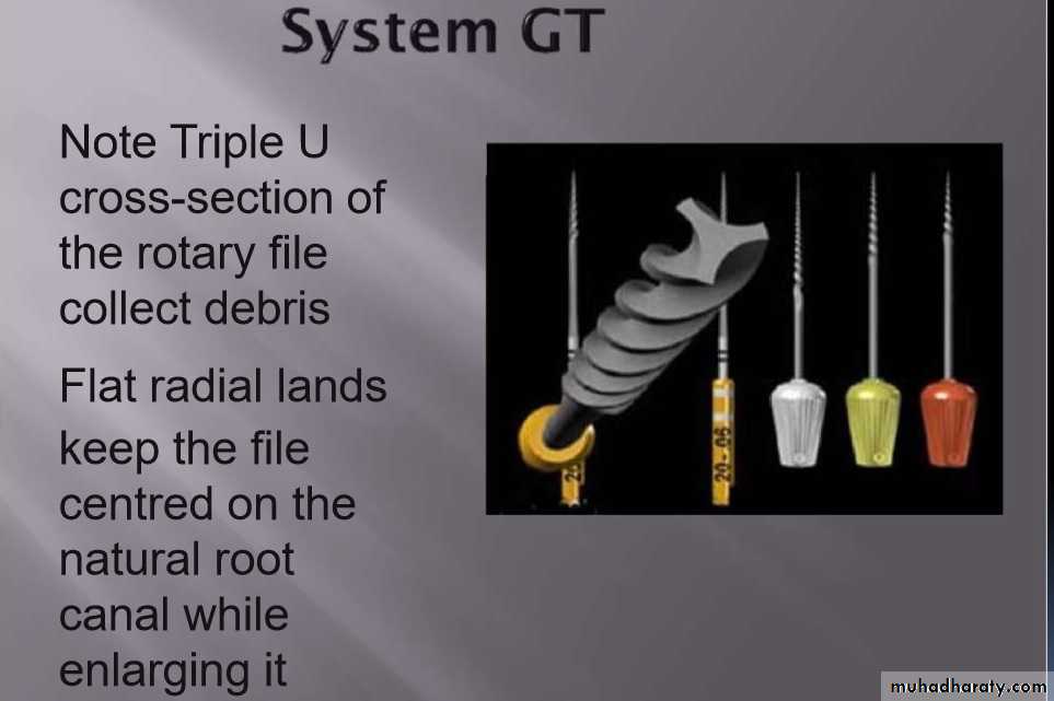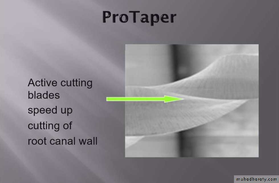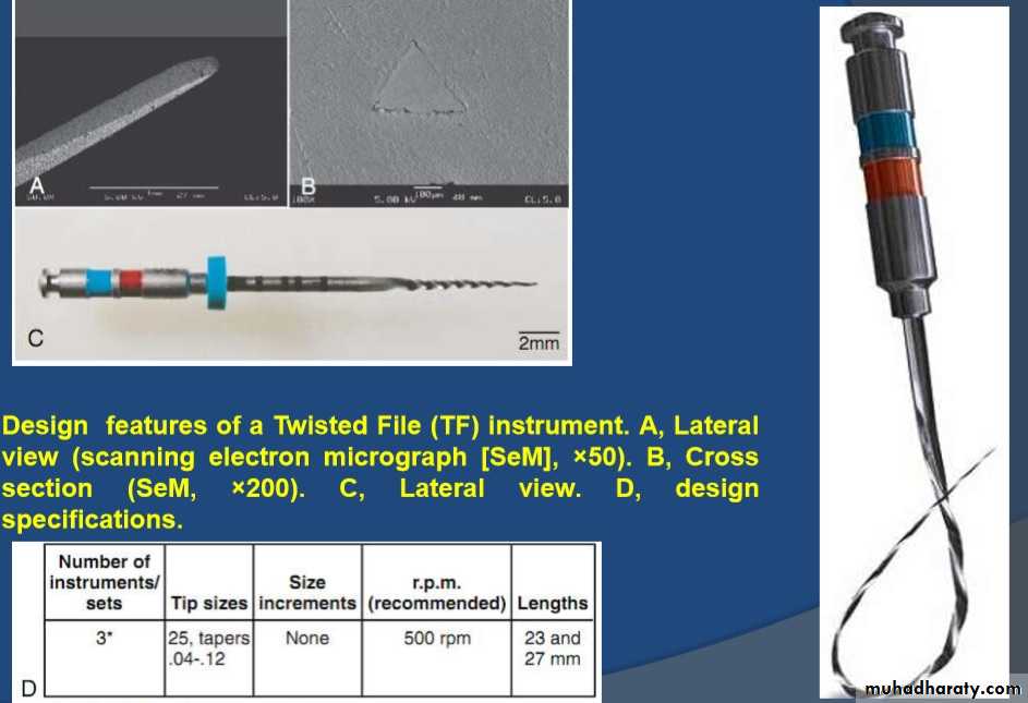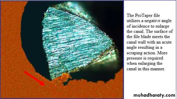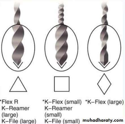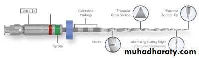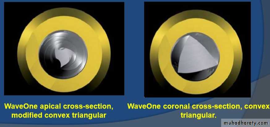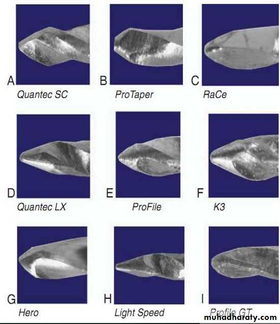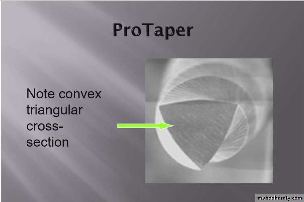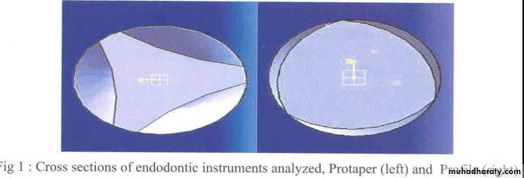 The instruments are designed to work with a reverse cutting action.All instruments have a modified convex triangular crosssection at the tip end, and a convex triangular cross-section at the coronal end . This design improves instrument flexibility overall