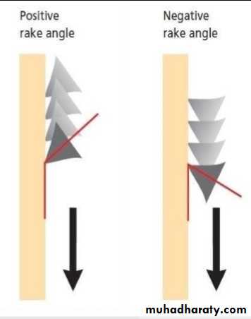 If the file is sectioned perpendicular to its long axis, the rake angle is the angle formed by the leading edge and the radius of the file. If the angle formed by the leading edge and the surface to be cut (its tangent) is obtuse, the rake angle is said to be positive or cutting.If the angle formed by the leading edge and the surface to be cut is acute, the rake angle is said to be negative or scraping.