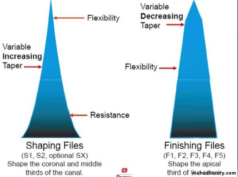 The 3 shaping files have taper increase coronally, and the reverse pattern is seen in the fifth finishing file.