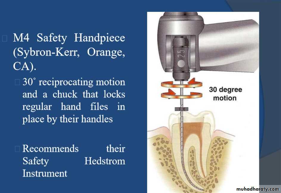 The specially designed NiTi files work in a similar but reverse “balanced force” action using a preprogrammed motor to move the files in a back and forth “reciprocal motion”The counter-clockwise (CCW) movement is greater than the clock-wise (CW) movement. CCW movement advances the instrument, engaging and cutting the dentine.