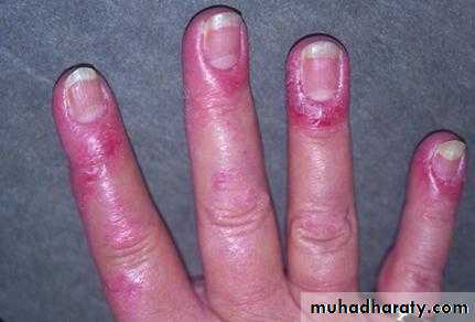 Dermatomyositis the muscle manifestations are similar to those of polymyositis but occur in combination with characteristic cutaneous manifestations: