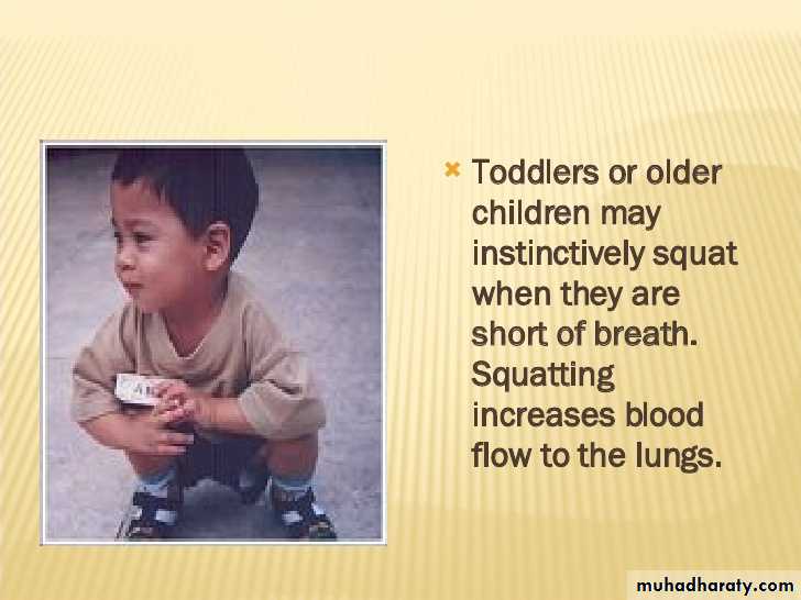 • Toddler patient adapt squatting position during the spell in attempt to increase systemic venous return and then increase pulmonary blood flow.