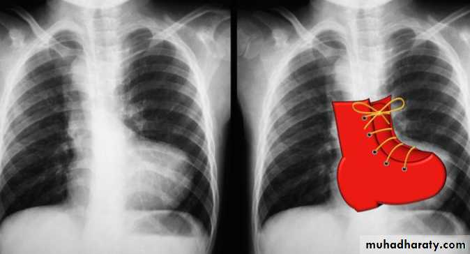 • CXR: shows boot-shaped heart (created by small main pulmonary artery and upturned apex secondary to RVH) and oligemic lung fields.