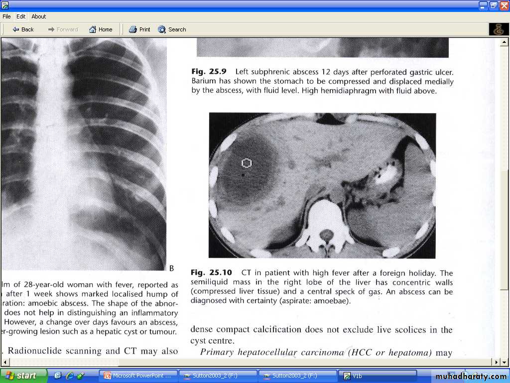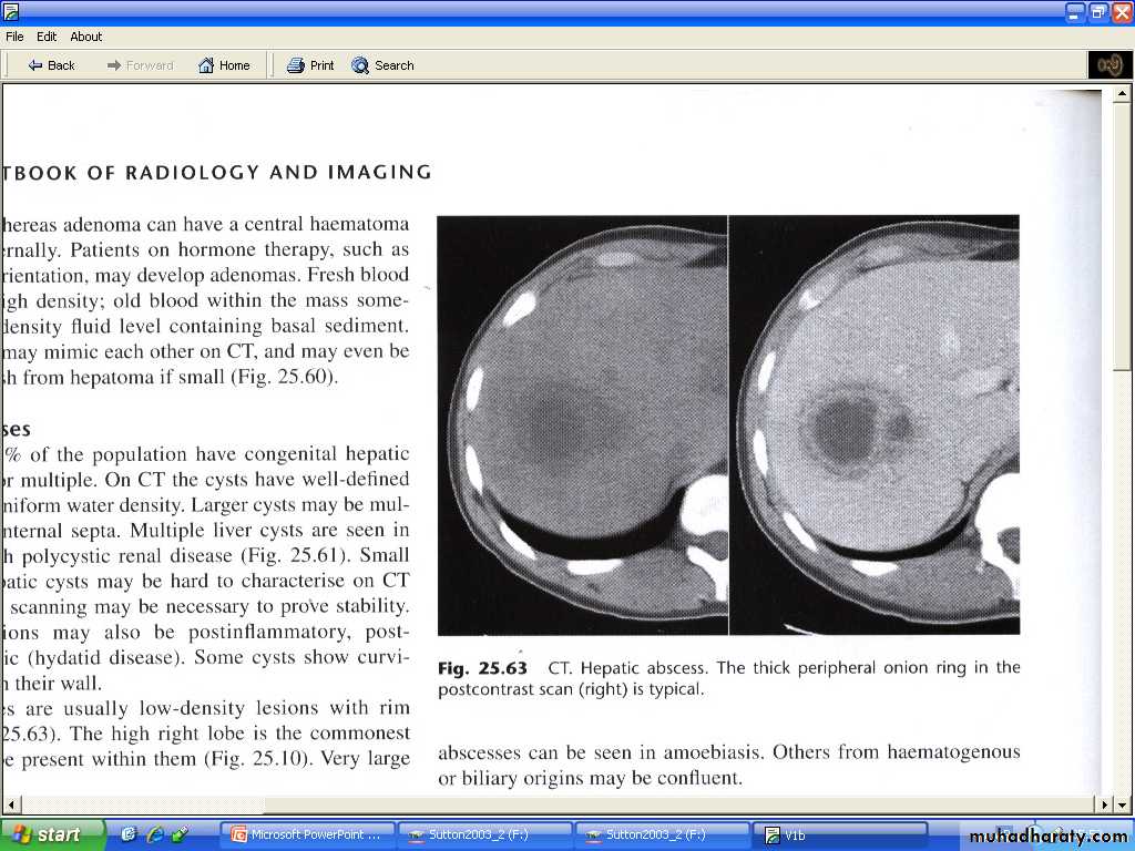 Hepatic abscess tend to have fluid centers , with walls that are thicker , more irregular and more obvious than those of simple cysts.At CT : the core fluid have attenuation values may be same as water , usually they are higher .