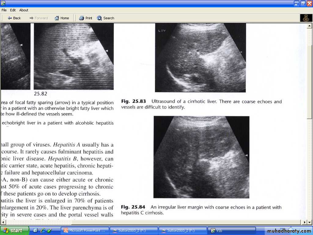 In acute viral hepatitis the liver is enlarged in 70%, splenic enlargement in 20% of cases.By US : liver parenchyma usually normal and decrease echogencity in severe cases and portal vessels more echogenic than normal. GB wall thickened may also be observed.