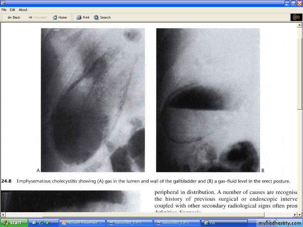 Infection with specific coliform organism or clostridium welchii may resuls in emphysematous cholecystitis , particularly in patient with DM and immunocompramized with mural air seen on plain abdomen or CT.
