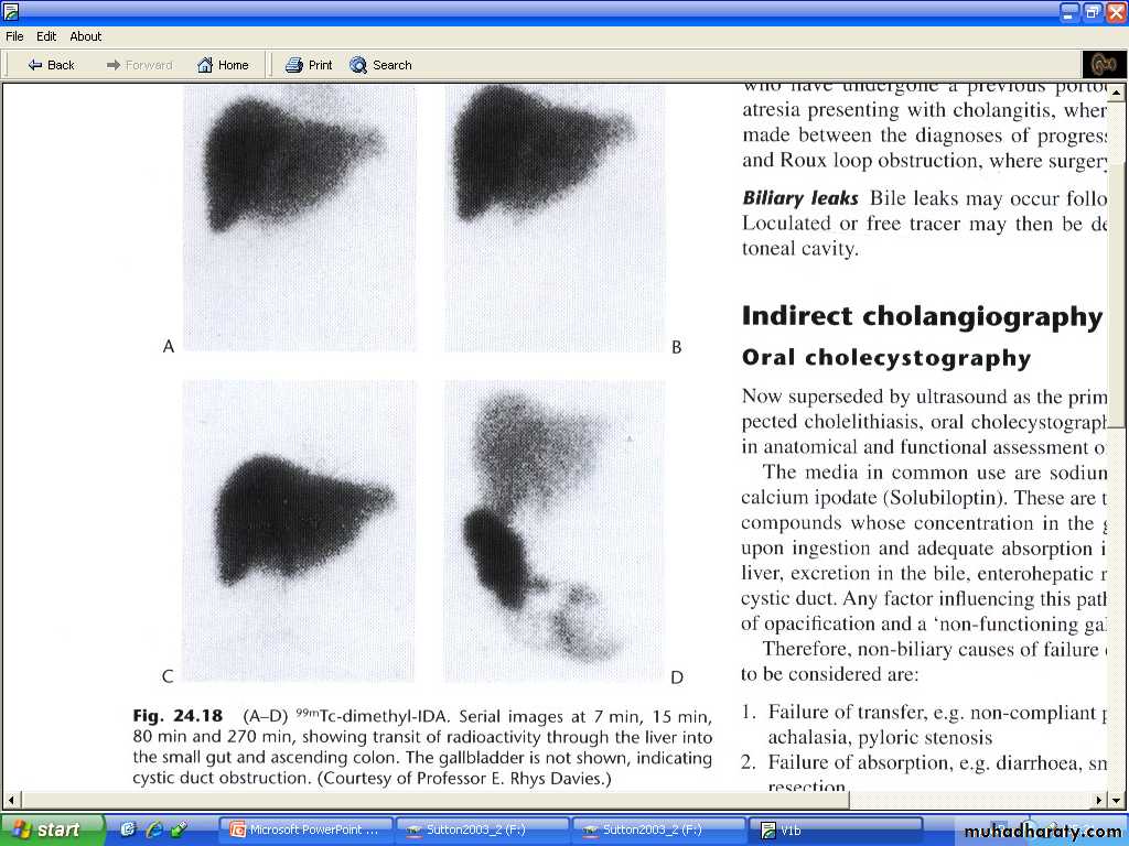 Radionuclide imaging using hepatobiliary agents ( e.g. 99m TC-HIDA ). Hepatic excretion occurs despite relatively high serum bilirubin levels, and, therefore, these agents can be used when the patient is jaundiced, even with serum bilirubin levels of up to 250 μmol/L (15 mg%). The main use of this technique is in patients with suspected biliary leak following biliarysurgery. The technique may also be used in acute cholecystitis (with nonfilling of the gall bladder in cases of an impacted stone in the cystic duct) or in children, when biliary atresia is suspected.