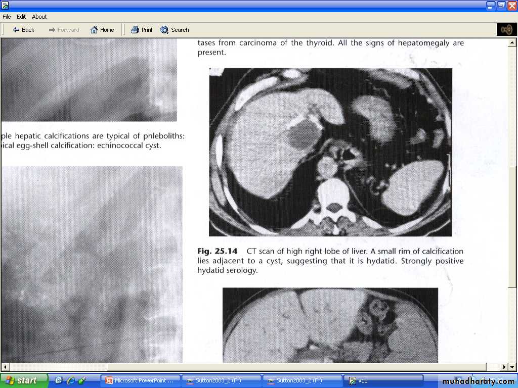 Plain abdomen : Restricted uses in hepatic disease ( shows calcified foci in the liver & some time shows hepatic enlargement )