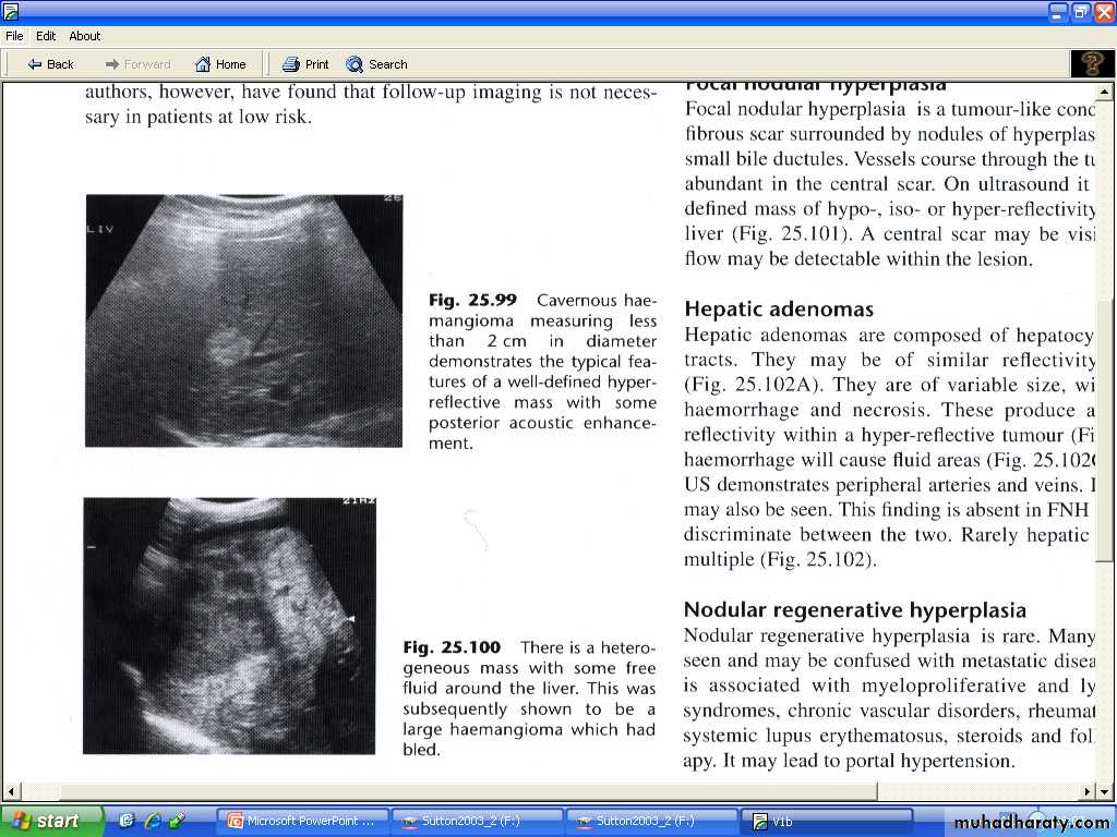 Often incidental finding, single or multiple , occasionally can cause significant hemorrhage , especially following trauma therefore percutanous biopsy should be avoided.Resemble neoplasm and other masses at US , usually hyperechoic and well defined .