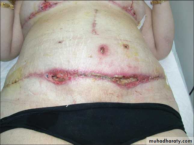 1-Bleeding ,Hematoma (risk is 3-4%)2-Infection (risk is less than 1 %)3-Keloid (heavy scar)4-Puckered skin and Skin irregularities 5-Seroma6-Skin necrosis or skin death (more likely with smokers)7-Slow healing8- wound dehecenceCosmetic surgery