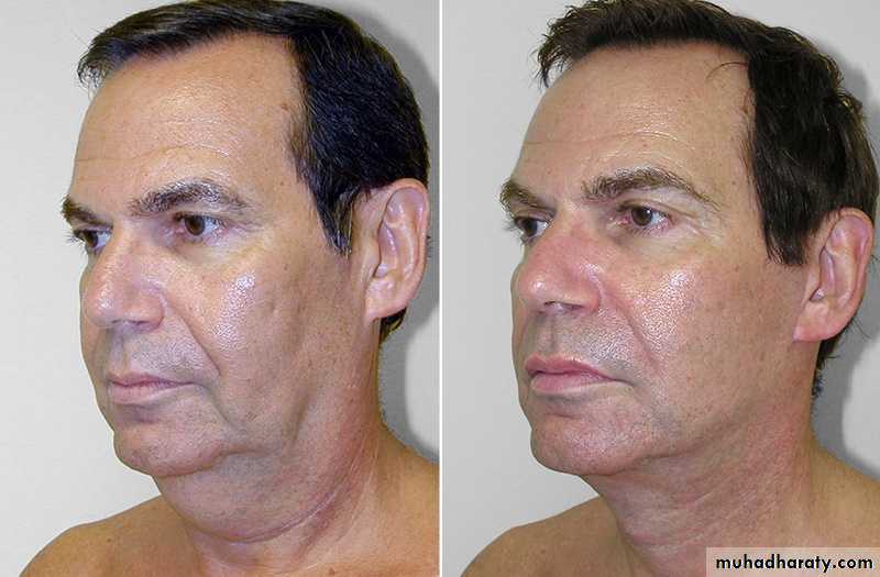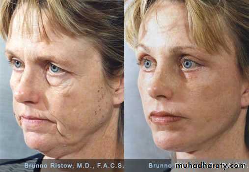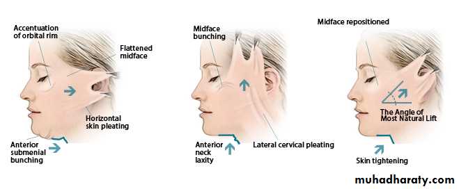 Excess facial skin and fat, particularly in the lower face, can be removed or reducedTwo symmetric incisions are made from the hair line of scalp to the preauricular skin to the postauricular sulcus and into the posterior scalp to allow the elevation of bilateral cheek flaps, which are then advanced posteriorly to resects an ellipse of facial and scalp skin and tighten the facial tissues along a vector parallel to the jawline.