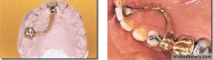 b. Spring cantilever: This is a special cantilever bridge exclusively designed for replacing maxillary incisors but these dentures can support only a single pontic. Support is obtained from posterior abutments (usually a single molar or a pair of splinted premolars).