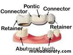 • Retainer: its part that seats over (on or in) the abutment tooth. It could be major or minor.• Pontic : It is the suspended member of fixed partial denture that replaces the missing tooth or teeth. It usually occupies the position of the missing natural tooth.
