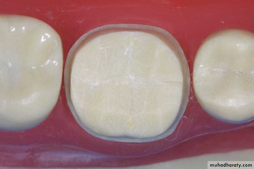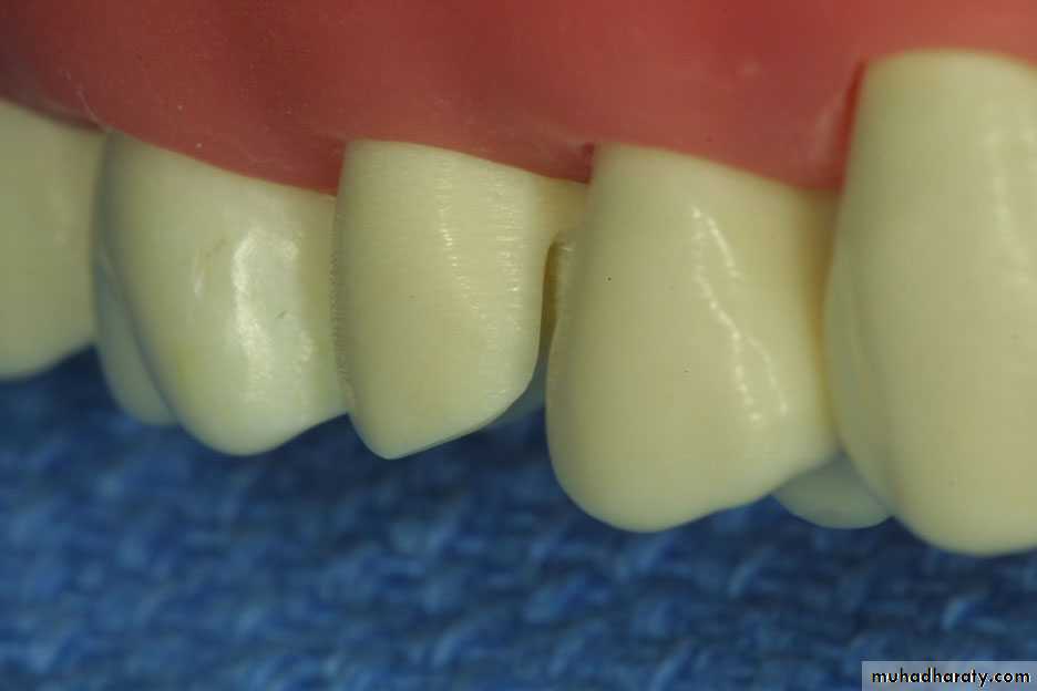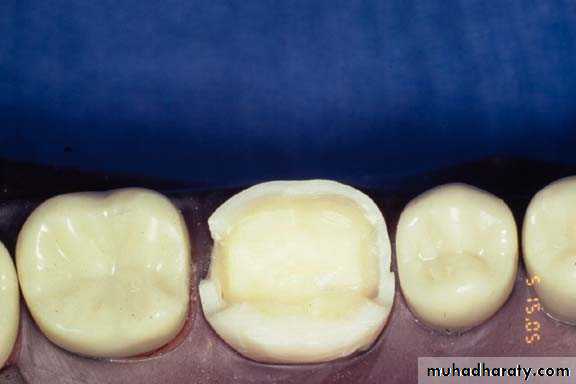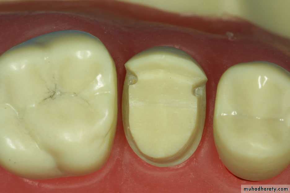 We should placed (d.o.g) on the center of the lingual surface, and then the remaining part of the tooth is reduced in one step according to anatomy of the tooth. The finishing line is chamfer.4. Proximal surfaces preparation