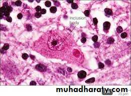 During viral multiplication within host cells, virus specific structures called Inclusion bodies sometimes called elementary bodies may be produced. They are larger than the virus particle contains host protein, ribosomal components or DNA/RNA fragments and can be stained by dyes (eg, eosin or acid dye). They may be formed in the nucleus (e.g. herpesvirus), in the cytoplasm (e.g. poxvirus), or in both nucleus and cytoplasm (e.g. measles virus). In many viral infections, the inclusion bodies are the site of development for the virions (the viral factories). The inclusion bodies are diagnostic for the infection with the virus. The intra cytoplasmic inclusion in nerve cells (the Negri body) is pathognomonic for rabies viral infection.