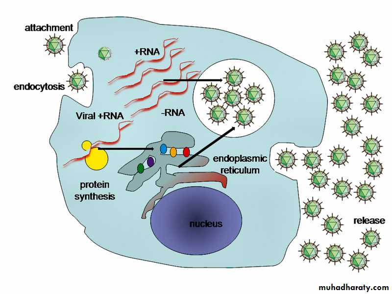 This stage includes the remove of viral capsid by degradation using viral enzymes or host enzymes or by simple dissociation; the end-result is the releasing of the viral genomic nucleic acid inside host cell cytoplasm. The infectivity of the parental virus is lost at the uncoating stage.Replication: