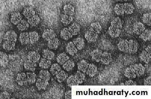 Isometric: apparently spherical and (depending on the species) from about 18 nm in diameter and more. The example in the picture shows Tobacco necrosis virus, genus Necrovirus.