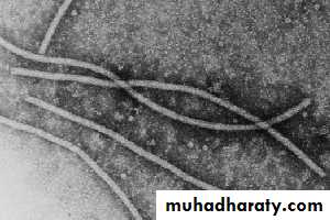 Filamentous: usually about 12 nm in diameter and more flexible than the rod-shaped particles. They can be up to 1000 nm long, or even longer. Some viruses have two or more different lengths of particle and these contain different genome components. The example in the picture shows Potato virus Y, genus Potyvirus.