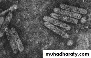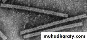 Rod-shaped: about 20-25 nm in diameter and from about 100 to 300 nm long. These appear rigid and often have a clear central canal (depending on the staining method used). Some viruses have two or more different lengths of particle and these contain different genome components. The example in the picture shows Tobacco mosaic virus.