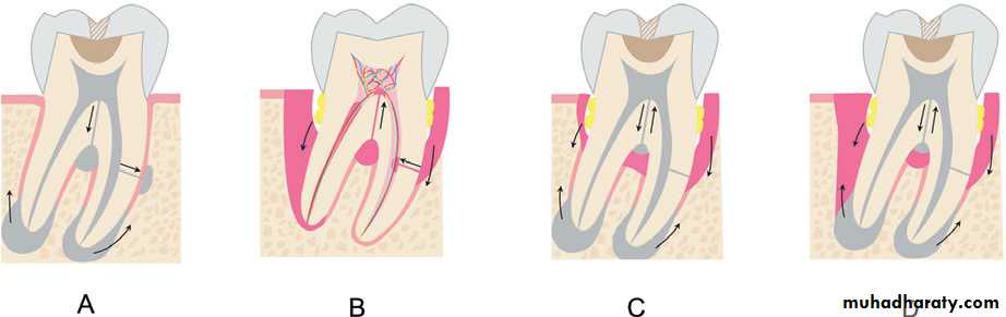 Classification of endodontic-periodontic lesions. (A) Primary pulpal infection can lead to chronic periradicular periodontitis by which a periapical radiolucency can develop and migrate cervically. Mandibular molars can also have accessory canals in lateral orientation or in the furcation area. These accessory canals can allow migration of the primary pulpal infection and cause secondary breakdown of the periodontium at their respective loci. (B) Primary periodontal infection can lead to extensive breakdown of alveolar crest bone that migrates from the cervical area to the apex. In these lesions, one would find generalized bone loss around a single tooth or that often could involve multiple adjacent teeth. Because of the pulpal-periodontal continuum through main root canal foramina or through accessory canals, extensive periodontal infection can cause irritation in the pulp tissues. (C) Both primary pulpal infection and primary periodontal infection can occur simultaneously in an “independent” endo-perio lesion, exhibiting the characteristics of both. (D) Primary pulpal and primary periodontal infections can occur extensively in this “combined” endo-perio lesion.