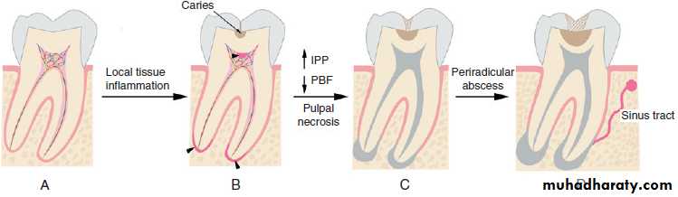 Progression of the pulpal and periradicular pathosis. (A) Normal tooth without any pulpal pathosis is richly vascularized and innervated. (B) With microbial challenges such as caries, local tissue inflammation can occur in the pulp adjacent to the site of carious lesions, as well as in the apical regions (arrowheads). (C) Pulpal inflammation can lead to reduction in pulpal blood flow (PBF) caused by an increase in intrapulpal pressure (IPP), causing pulpal necrosis (shown in gray). (D) Pulpal necrosis, if left untreated, can cause chronic inflammation of periradicular tissues and abscess formation, leading to a draining sinus tract.