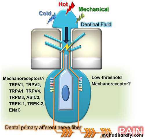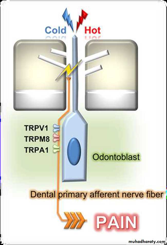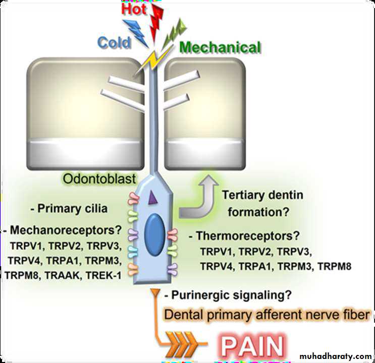 ODONTOBLAST RECEPTOR THEORYodontoblastic processes are exposed on the dentine surface and can be excited by a variety of chemical and mechanical stimuli.
