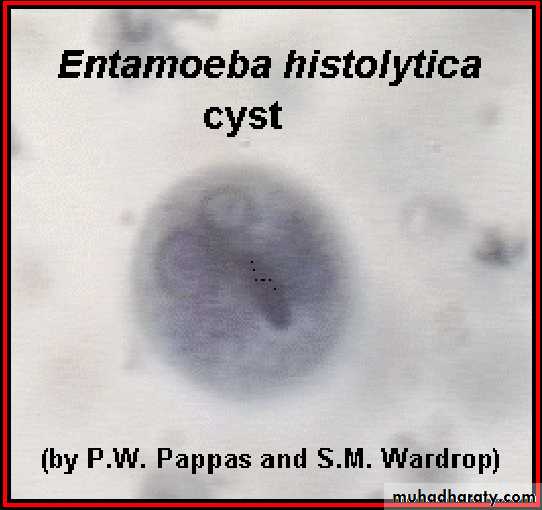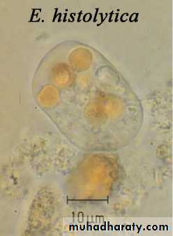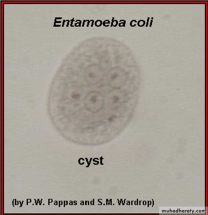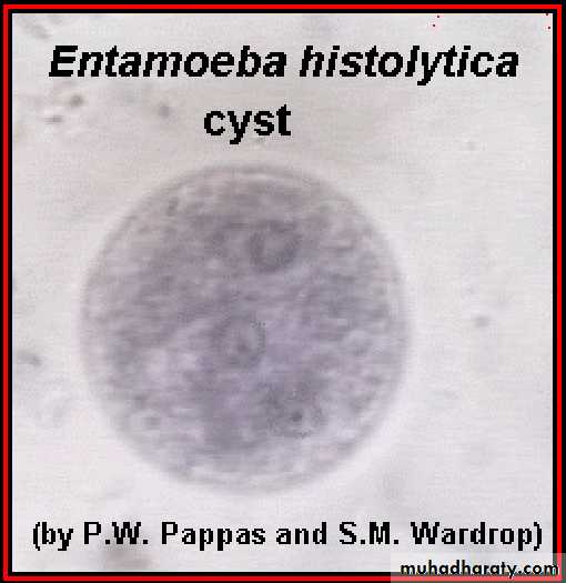 Laboratory diagnosis. An iodine-stained cyst of the pathogen Entamoeba hystolytica with 4 nuclei is illustrated. The harmless commensal Entamoeba coli has larger cyts with 8 nuclei. Furthermore, recall that E. histolytica has a lookalike E. dispars that is harmless.