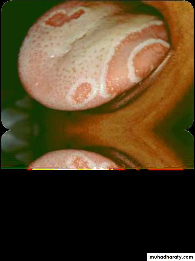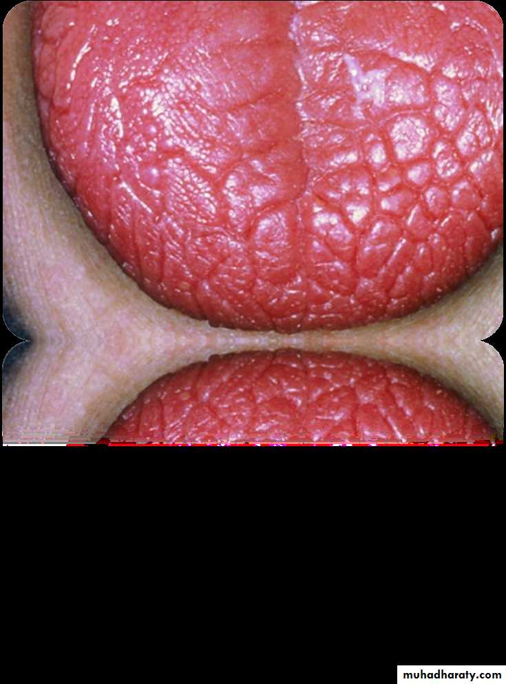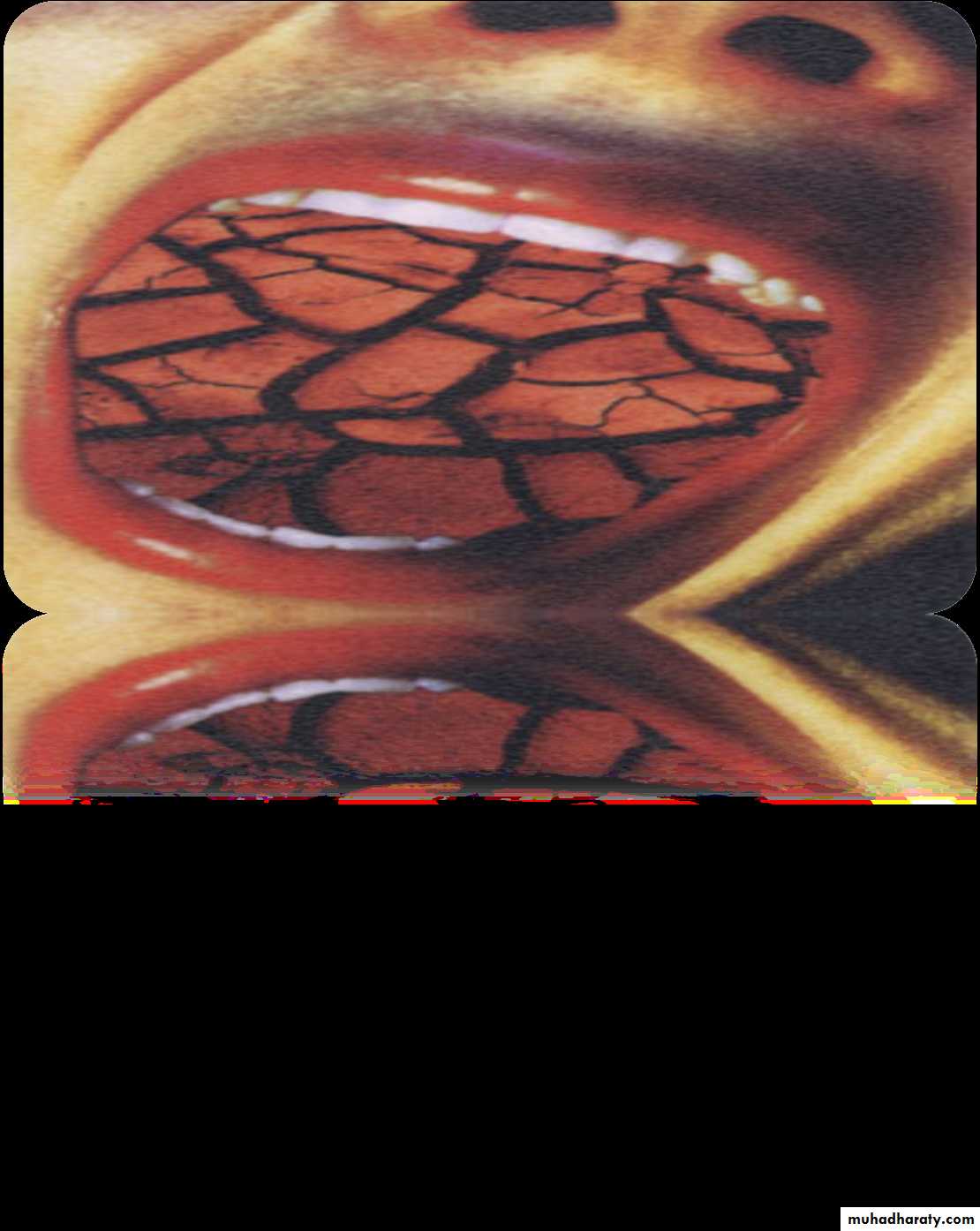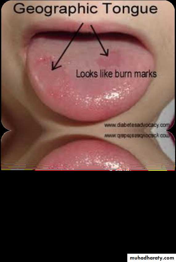 Enlarged by loss of teeth and decrease in taste buds, it become lobulated, coarse or flat, and red.Geographic tongue may appear as an emotional episode.