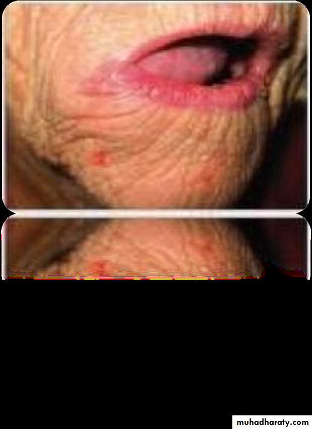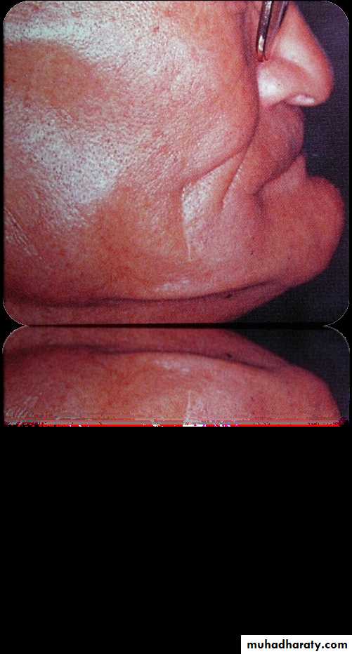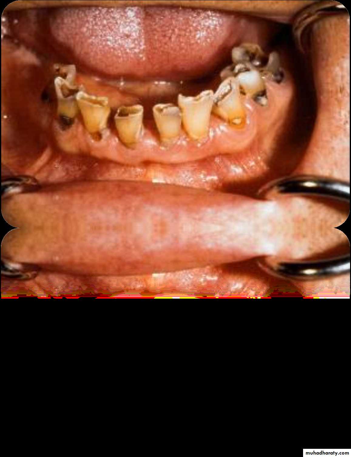 Angular cheilitis is very common. Falling in of lips due to the loss of adequate support and muscle tone. The facial musculature loses elasticity and resiliency with advancing.Tempromandibular joint