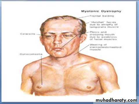 Myotonia, cognitive dulling, cardiac conduction abnormalities, lens opacities, frontal balding, hypogonadism.