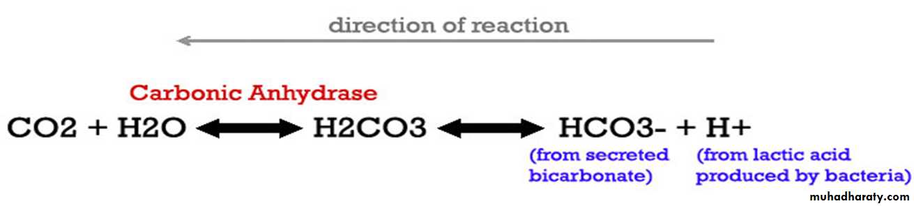 The increase in the carbonic acid concentration lead to more carbon dioxide escape from saliva making it possible for more bicarbonate to bind to hydrogen ions (H+), which will end in the removal of the acid.