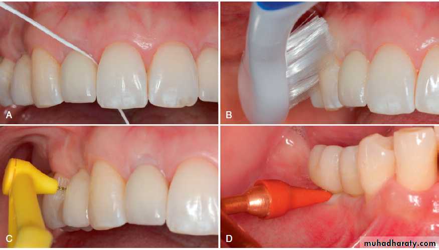 Methods for patient oral hygiene are shown. (A) Flossing. (B) Bass method of brushing with an extra-soft toothbrush. (C) Interproximal brushing. (D) Removal of biofilm with a rubber tip. Hygiene methods remove biofilm along the gingival margin.