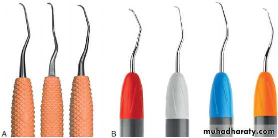 (A) Plastic probe: Colorvue. (B) New Implacare II Barnhart #5-6 cone socket plastic curette tips that screw into an autoclavable stainless steel handle.