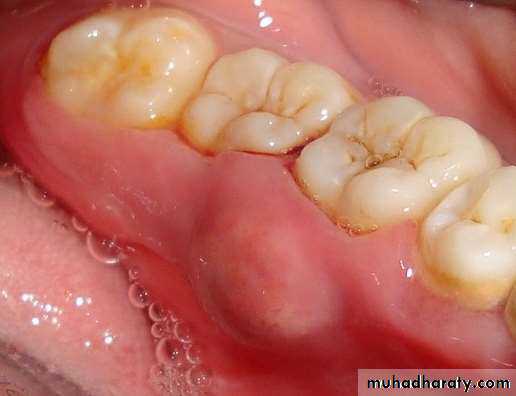 • Pericoronal abscess: Localized accumulation of pus within the overlying gingival flap surrounding the crown of an incompletely erupted tooth.