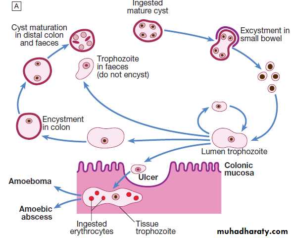 The parasite may invade the mucous membrane of the large bowel, producing lesions that are maximal in the caecum (flask-shaped ulcers)/ may cause severe haemorrhage