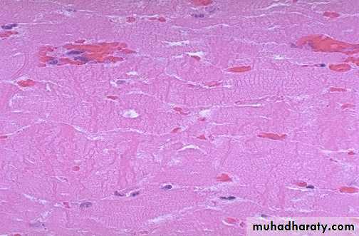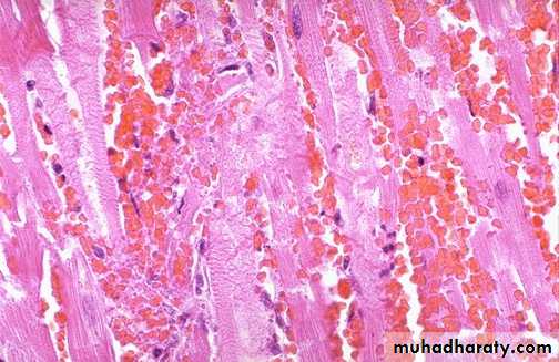 In this microscopic view of a recent myocardial infarction, there is extensive hemorrhage along with myocardial fiber necrosis with contraction bands and loss of nuclei (1-2days).