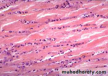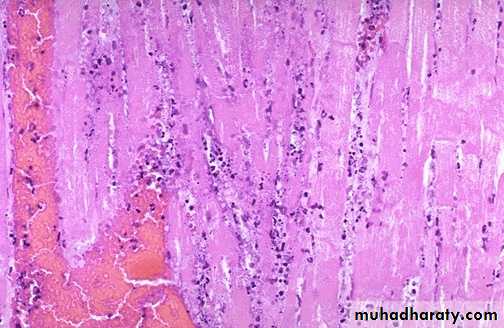 This photomicrograph shows a zone of coagulative necrosis. There are numerous neutrophils between necrotic myocytes. Neutrophils are prominent in the first few days of a myocardial infarct.Heart, contraction band necrosis - High power