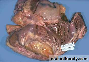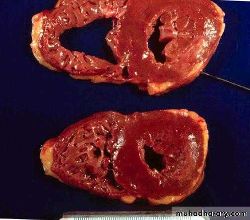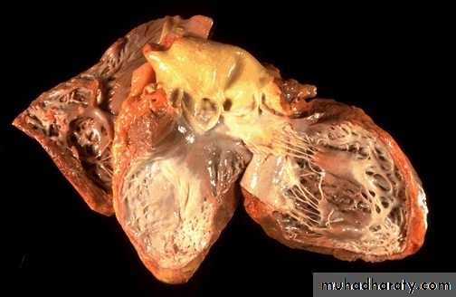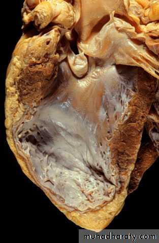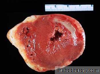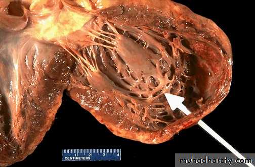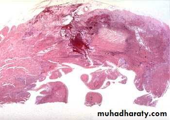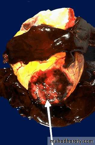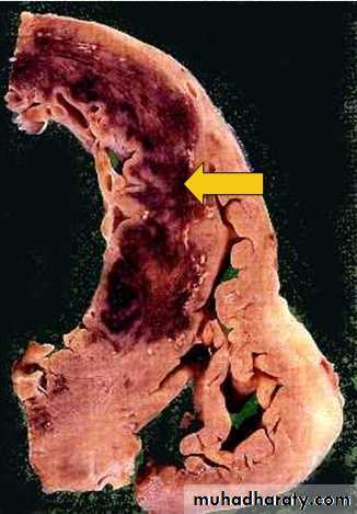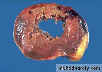 collagenization following healing of a subendocardial myocardial infarction (remote}.• One complication of a transmural myocardial infarction is rupture of the myocardium. This is most likely to occur in the first week between 3 to 5 days following the initial event, when the myocardium is the softest. The white arrow marks the point of rupture in this anterior-inferior myocardial infarction of the left ventricular free wall and septum. Note the dark red blood clot forming the hemopericardium. The hemopericardium can lead to tamponade.
