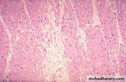 The earliest change histologically seen with acute myocardial infarction in the first day is contraction band necrosis. The myocardial fibers are beginning to lose cross striations and the nuclei are not clearly visible in most of the cells seen here. Many irregular darker pink wavy contraction bands extending across the fibers.
