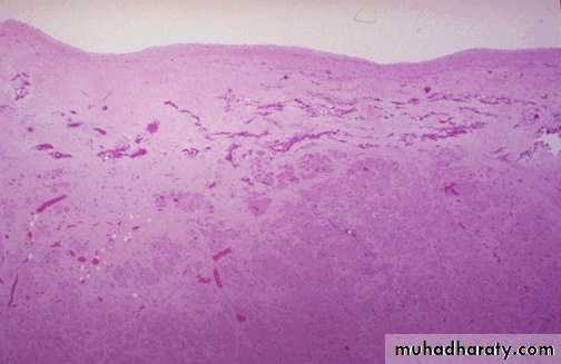 The aneurysm is a large oval zone located toward the apex of the left ventricle. An aneurysm forms when a region of the left ventricular wall is weakened by infarction and then thinned by the constant pressure of systolic contractions. Aneurysms at any site are often areas of abnormal flow and thus are predisposed to thrombosis. The aneurysm in this case has been filled by an organizing thrombus. Left ventricular thrombi can generate systemic emboli. Ventricular wall aneurysms may also cause congestive heart failure and dangerous arrhythmias.This high power microscopic view of the myocardium demonstrates an infarction of about 1 to 2 days in duration. The myocardial fibers have dark red contraction bands extending across them. The myocardial cell nuclei have almost all disappeared. There is beginning acute inflammation
