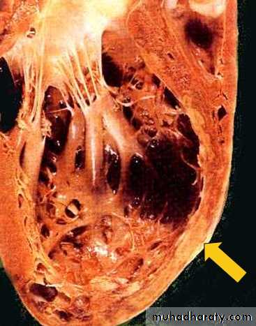 In cross section, the point of rupture of the myocardium is shown with the arrow. In this case, there was a previous myocardial infarction 3 weeks before, and another myocardial infarction occurred, rupturing through the already thin ventricular wall 3 days later.