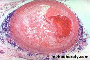This epicardial coronary artery is almost completely occluded by atherosclerotic plaque.The plaque looks pale and covered by eroded surface that induces release of thrombogenic substances into the narrow lumen that causes thrombus formation.