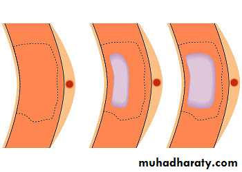 Then progressively more sharply delineated as yellow tan soft area, that in 10-14 days become rimmed by red granulation tissue.