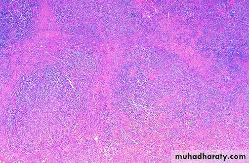 this is a cross section through the mesentery to reveal multiple enlarged lymph nodes that abut each other. Unlike metastases, nodes with lymphoma tend to have little necrosis and maintain a solid, fleshy tan appearance. High grade non-Hodgkin's lymphoma (NHL) tends to involve a single node, localized group of nodes or extranodal site. Low grade NHL tends to involve multiple lymph nodes.