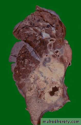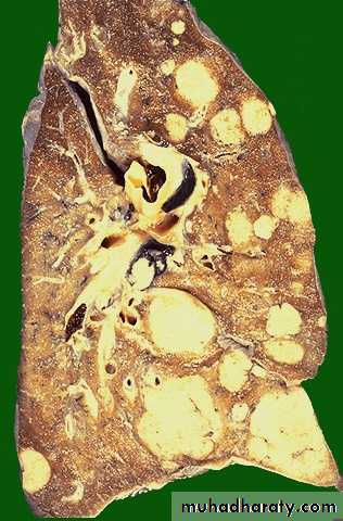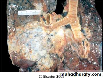 Typically central in location (major bronchi), frequently presenting with bronchial obstruction, and may undergo central necrosis, giving rise to cavitation.cavitation.