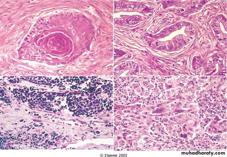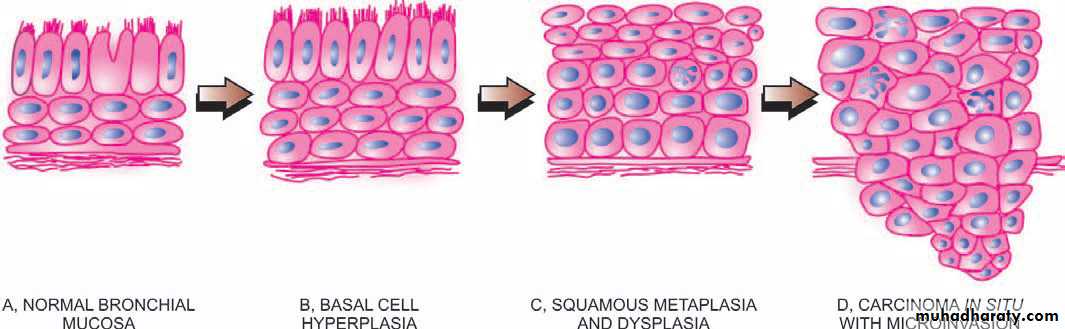 Smoking results in progressive alterations in the lining epithelium of the respiratory tract: basal cell hyperplasia and squamous metaplasia and progress to squamous dysplasia and carcinoma in situ, culminating in invasive cancer.Squamous and small cell carcinomas show the strongest association with tobacco exposure.